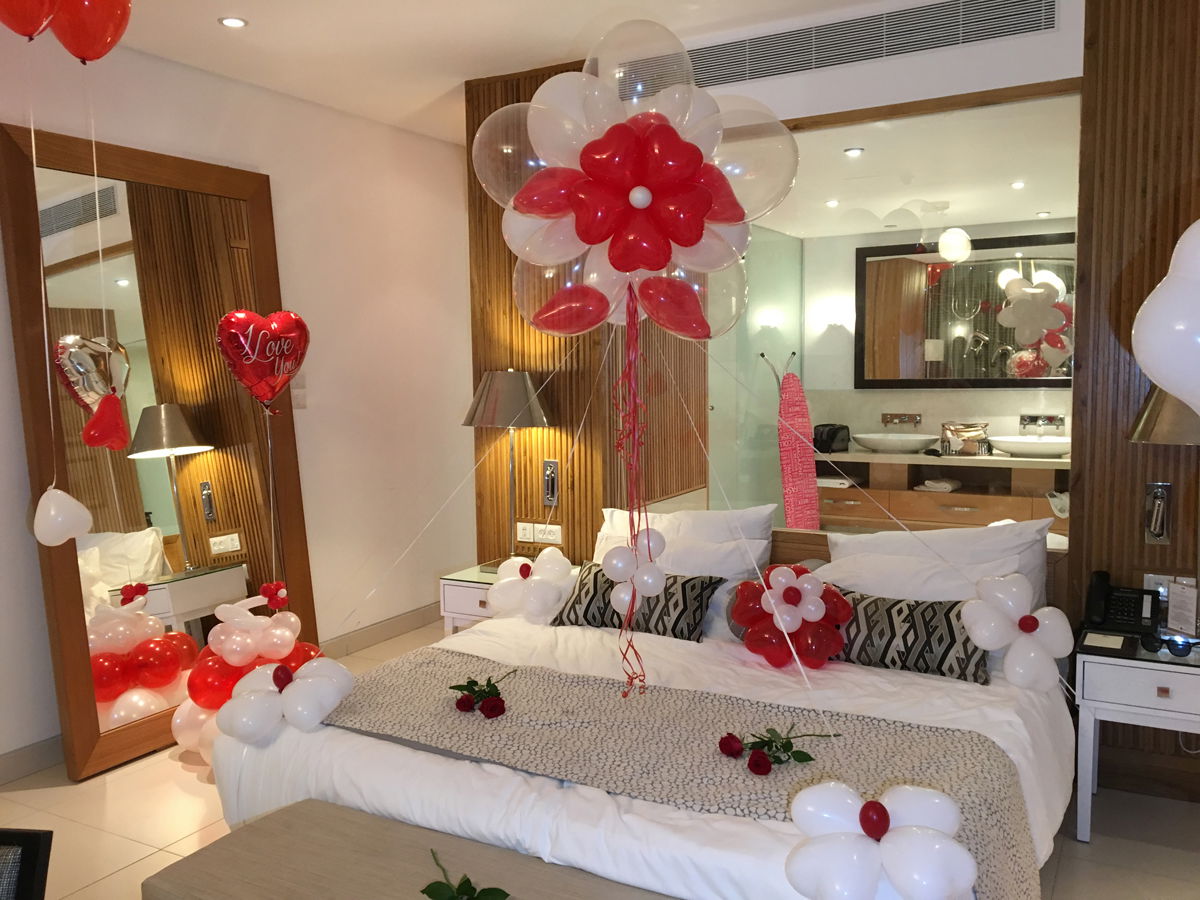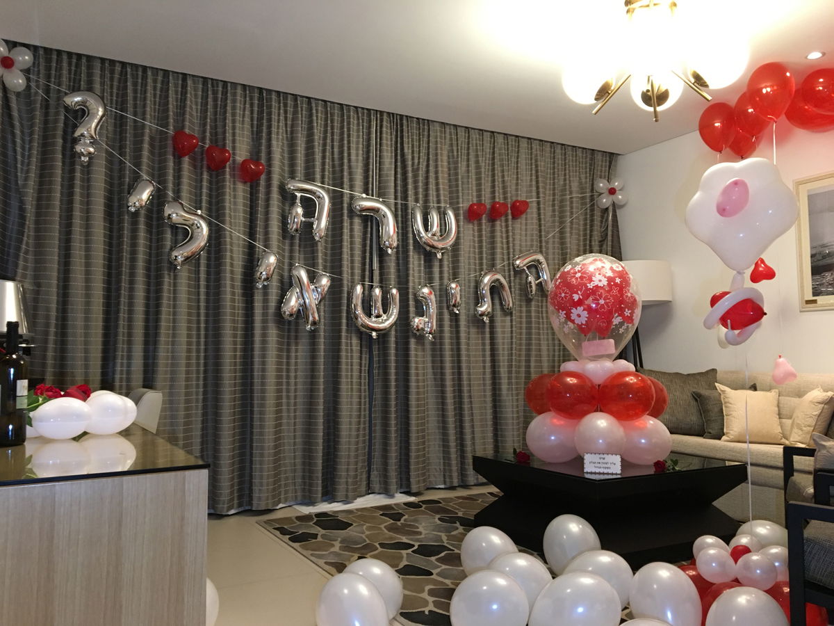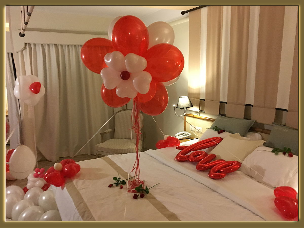 עיצוב מיטה: פרח תלת מימד עשוי מ 16 בלוני הליום \ 4 רביעיות פרחי בלונים בצידי המיטה \ לב עלי כותרת אדומים על המיטה \ אותיות תלויות מבלונים עם סלוגנים שונים רומנטיים או בלון שקוף ענק ובתוכו 10 לבבות אדומים להפרחה\ 2 סטנדים עם פרחי בלונים מעוצבים \ 20 בלוני הליום אדומים צמודים לתקרה קשורים לסרטים ובסופם לבבות צפים \ 20 בלונים לבנים מטאל על רצפת החדר \ בקבוק יין \ שוקולדים מובחרים.
