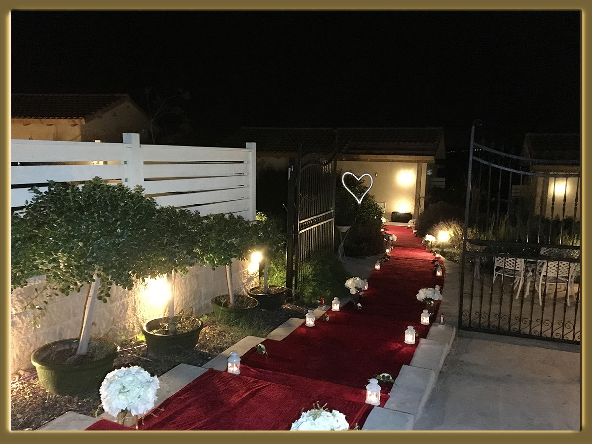 עיצוב צימר מרהיב בבלונים \ תיבה עם 30 בלוני הליום לבנים להפרחה \ שטיח קטיפה אדום \ פרחים לבנים מפוזרים בצידי השטיח \ זרי פרחים באגרטלי זכוכית \ עששיות עם נרות בצידי השטיח \ 4 מזרקות אש \ לב מואר\ מוזיקה \ עמדת שמפניה.